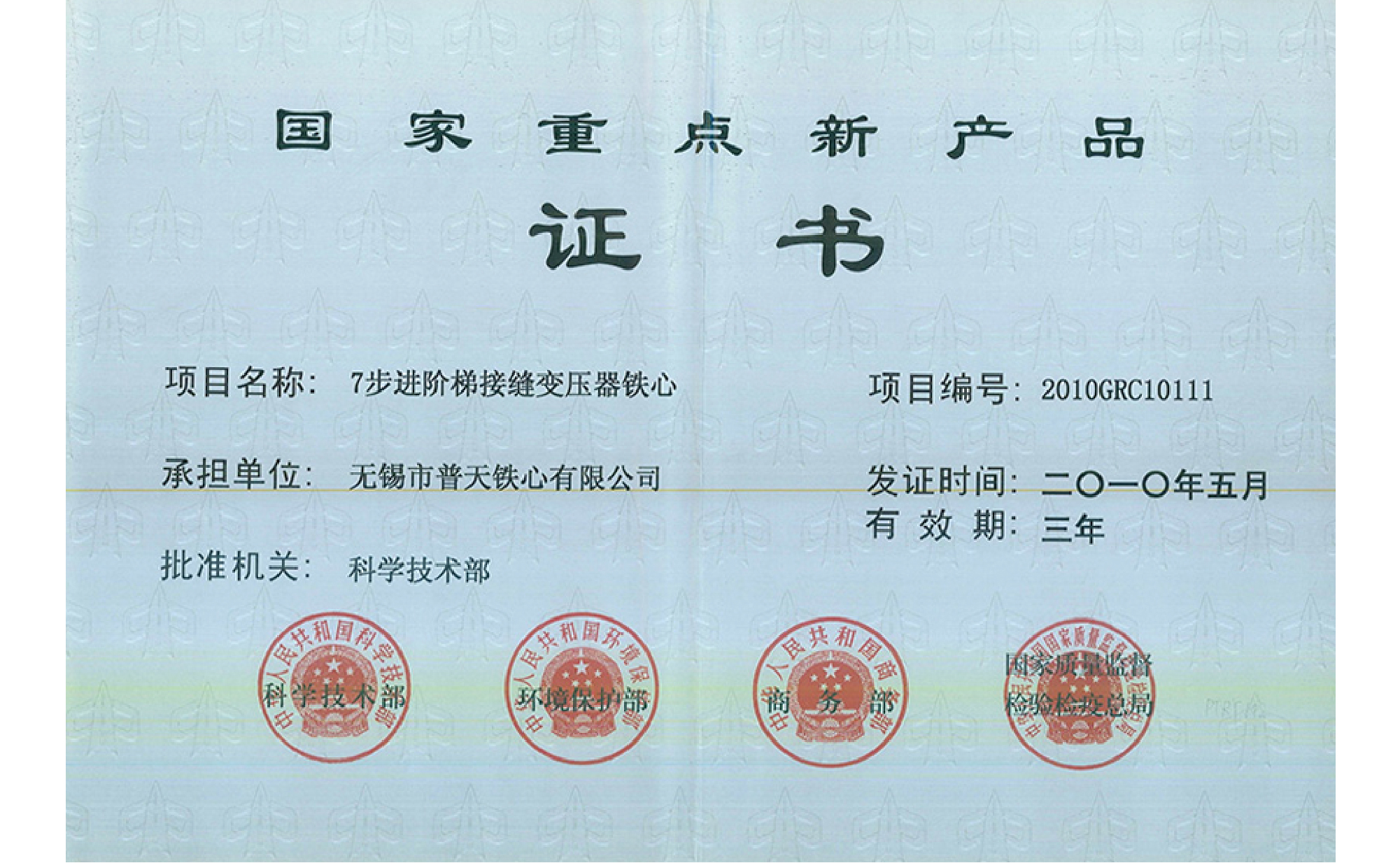 研發(fā)生產(chǎn)的“七步進(jìn)階梯接縫變壓器鐵心”被授予江蘇省高新技術(shù)產(chǎn)品認(rèn)定證書