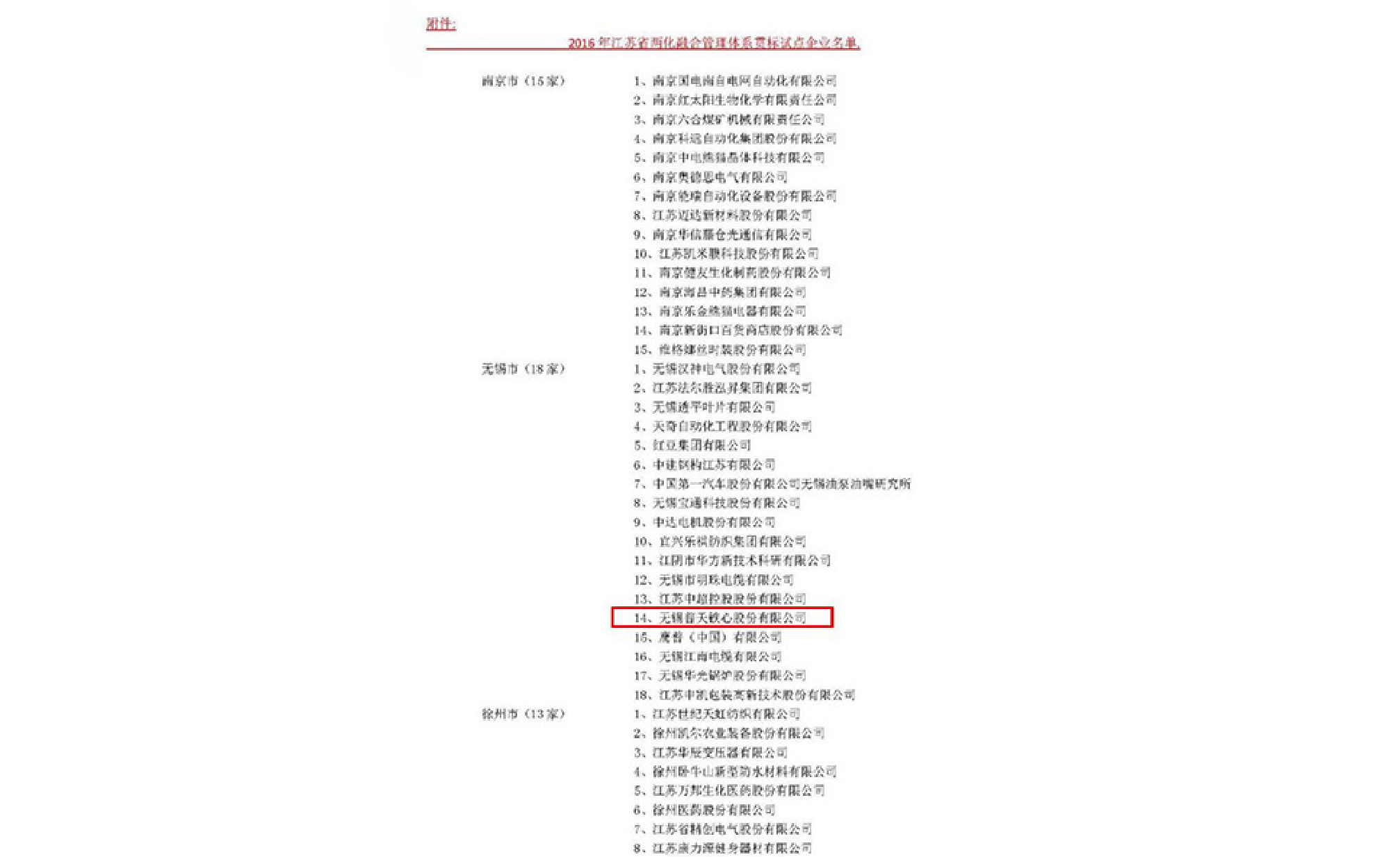 ·獲評(píng)江蘇省兩化深度融合創(chuàng)新(互聯(lián)網(wǎng)與工業(yè)融合創(chuàng)新)試點(diǎn)企業(yè)