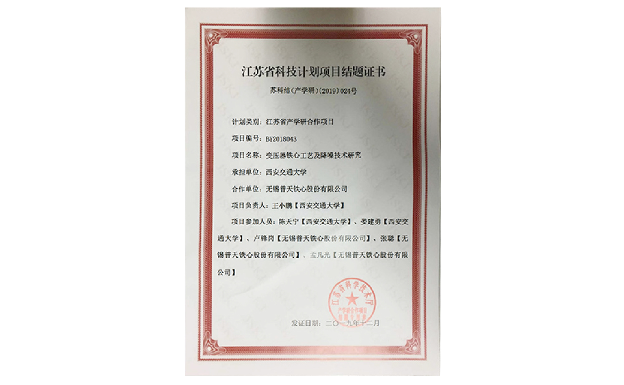 變壓器鐵心工藝及降噪技術(shù)研究獲得江蘇省科技計(jì)劃項(xiàng)目結(jié)題證書